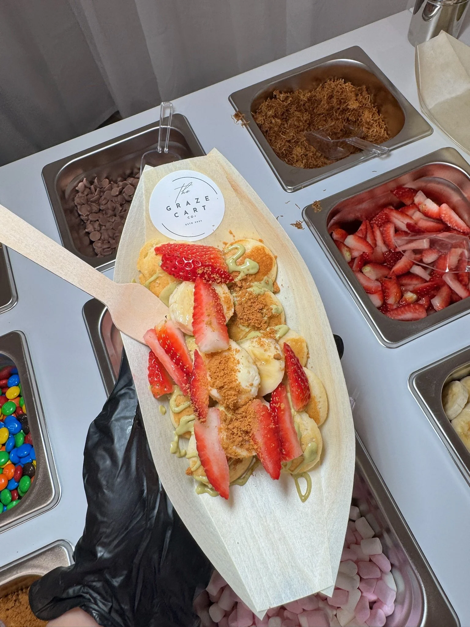 We’ve put a fresh and modern twist on the traditional grazing table with our signature grazing carts, charcuterie cups, boards, sweets carts, and even our fun, crowd favourite mini pancakes. Designed to be both aesthetic and practical, our setups are a standout feature that will elevate your event and leave a lasting impression.